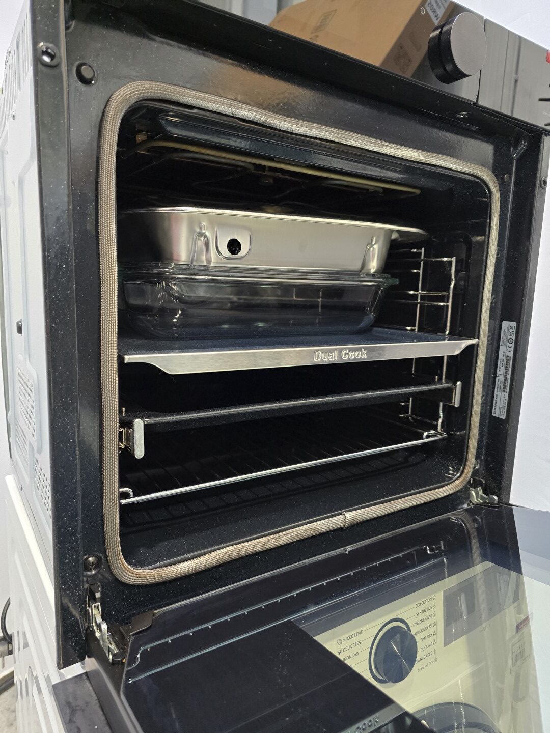 Puteti utiliza cu usurinta si simultan partea superioara si inferioara a cuptorului cu setari (Dual Cook) de temperatura si timp diferite, obtinand rezultate optime de gatire si econimie de timp si energie. Sistemul Dual Cook are 2 zone de gatit, superioara si inferioara care functioneaza independent sau impreuna. Folositi, de exemplu, o zona pentru preparate mai mici sau creeaza doua zone, pentru a pregati o varietate de alimente. Intregul cuptor este disponibil si pentru vase mari.