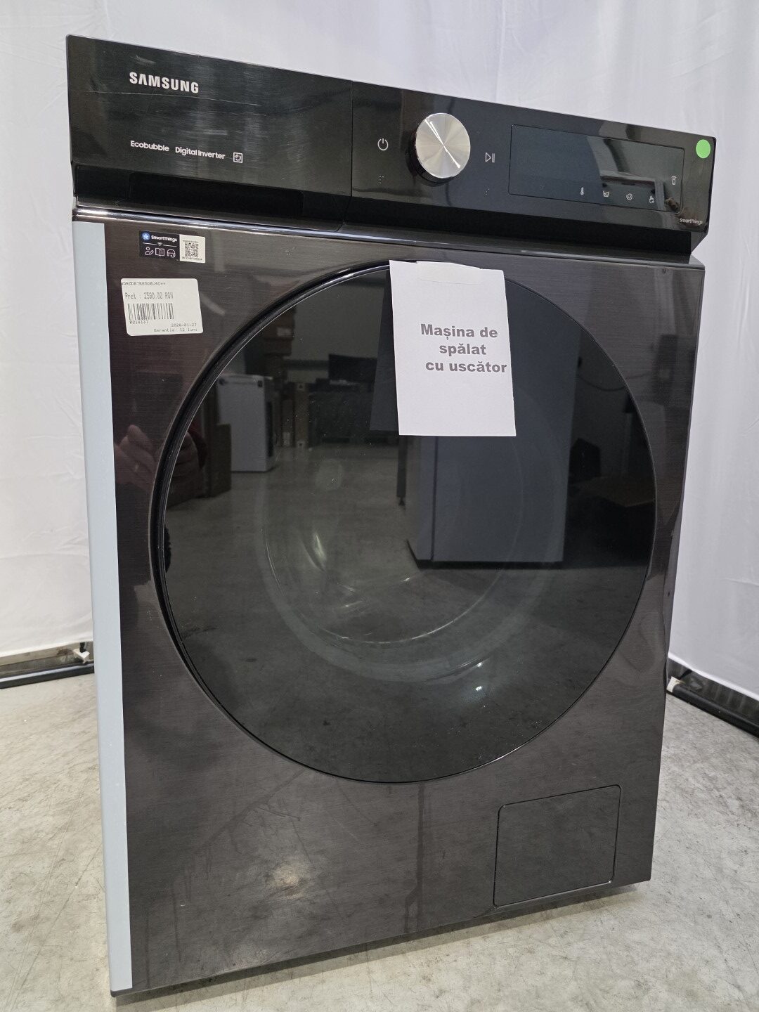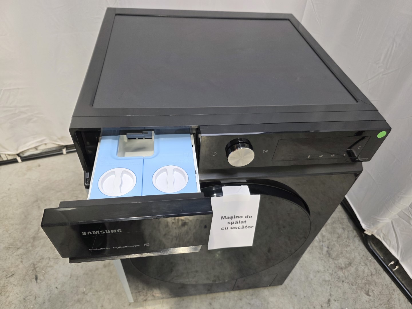 Masina de spalat rufe cu uscator Samsung Bespoke AI WD90DB7B85GBU4, Spalare 9 kg, Uscare 6 kg, 1400 RPM, Clasa D, AI Wash, Auto Dispense, AI Ecobubble, AI Control, Super speed 39 min, WiFi, Negru