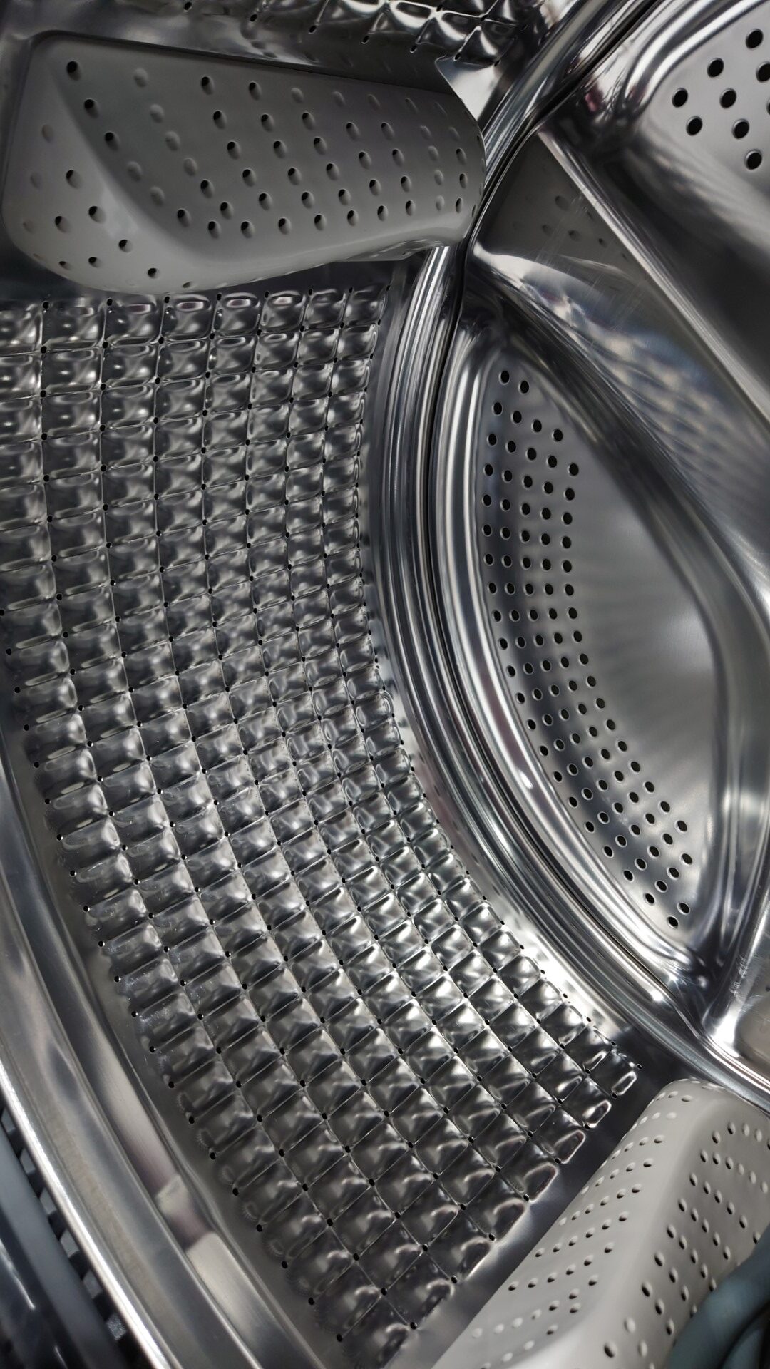 Tamburul mai mare (diametru de 52.5 cm fata de 49.5 cm) determina cresterea performantelor de spalare si usureaza procesul de calcare (rufele fiind scoase cu un grad mai mic de sifonare). Hubloul mare (36 cm), conceput special pentru a se deschide in unghi larg, usureaza incarcarea/descarcarea masinii chiar si pentru rufele voluminoase.Tamburul este iluminat pentru a facilita descarcarea rufelor.