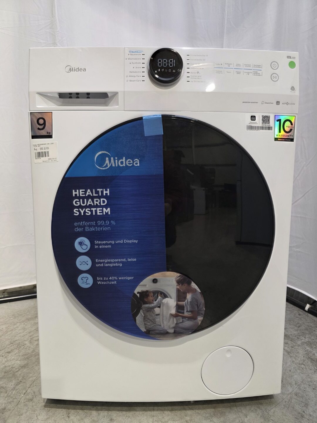 TurboDo you want to do your laundry before going out, but you are afraid it won’t finish in time? Use Turbo mode to shorten the wash cycle by up to 40%! | Add clothesHave you ever started your washer only to find out you have got some socks or a shirt that could use some refreshing? This is no longer a problem, as you can simply put more clothes in. Simply push and hold the Start/Pause button for 3 seconds, and add your clothes! | Wide doorYou’ll find that the Midea washer’s door are wider than the standard door, allowing you to put in a quilt, bedsheets or curtains with no problem – one motion is enough. A unique and elaborate door design make your washer present itself marvellously in your bathroom or kitchen |