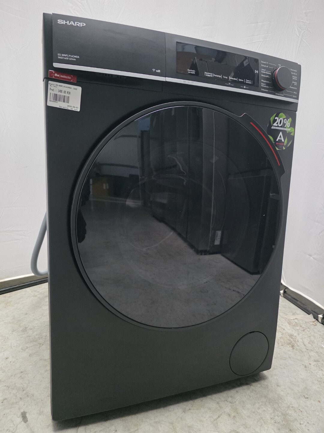 Masina de spalat rufe Sharp, 9 KG, 1400 RPM, Clasa A, Inverter Motor, AquaStop, AquaGuard, WiFi, LED Touch, Steam Function, Negru, ES-WNFL914CMDA-DE