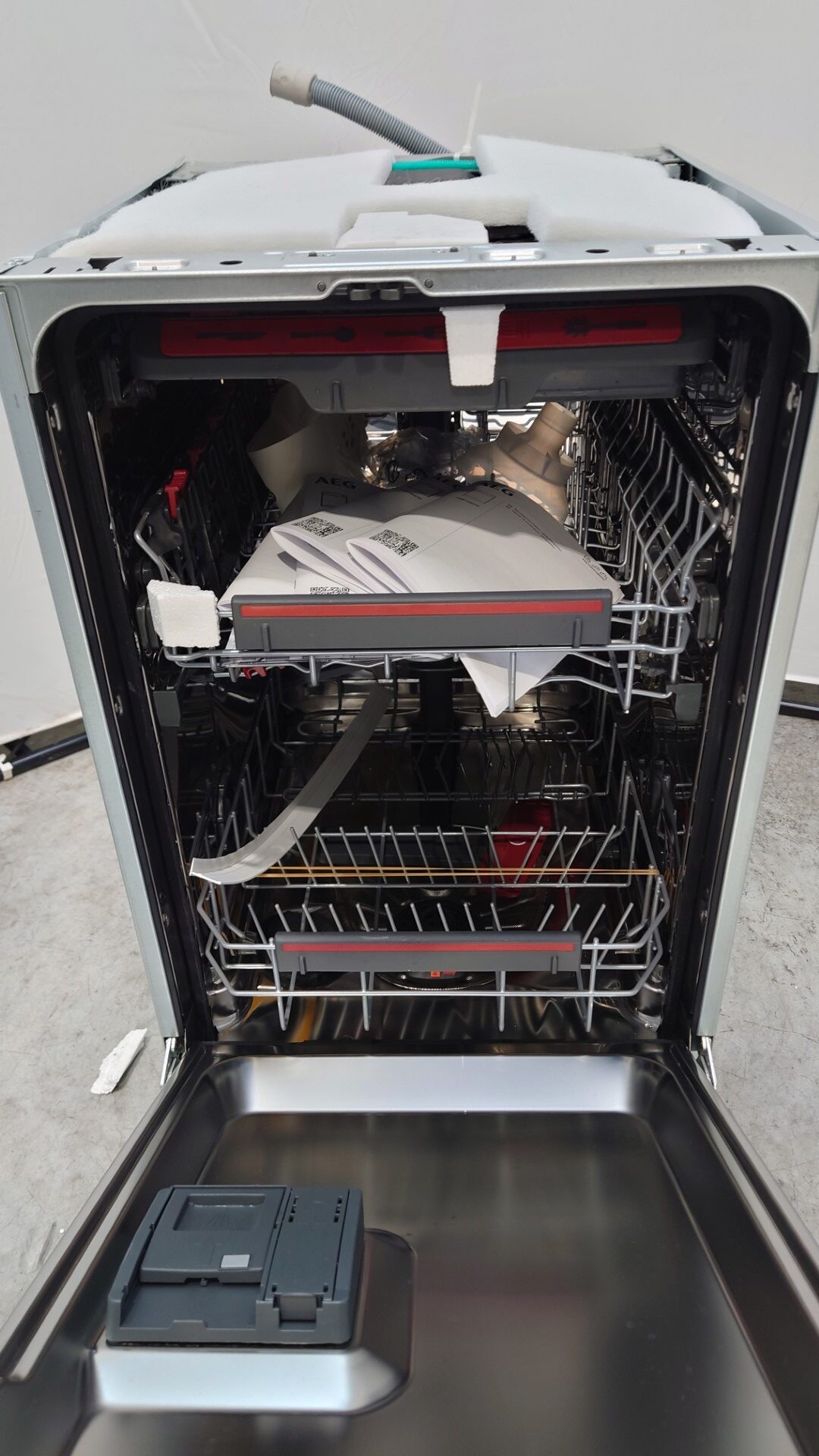• Masina de spalat vase incorporabila AEG FSE74527P, 10 seturi, 7 programe, MaxiFlex, AirDry, Usa slide, Motor inverter, SatelliteClean, Iluminare interioare, Time Beam, Clasa C, 45 cm