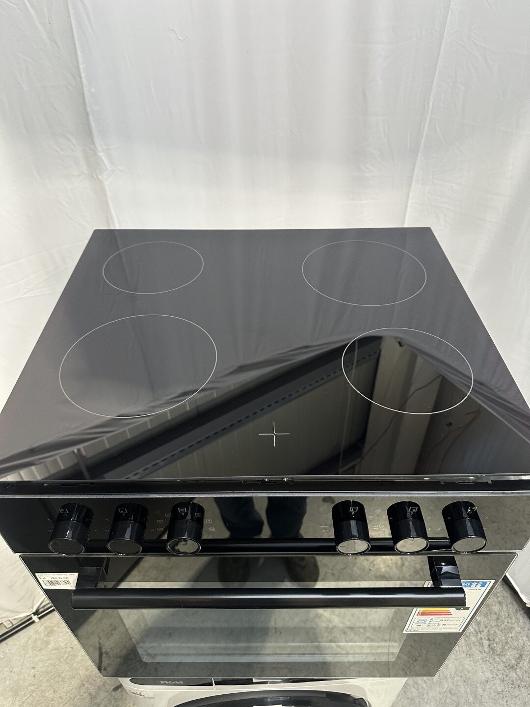 Cuptor electric negru cu ușă și panou de control din sticlă, alături de o plită separată din ceramică neagră cu patru zone de încălzire circulare.