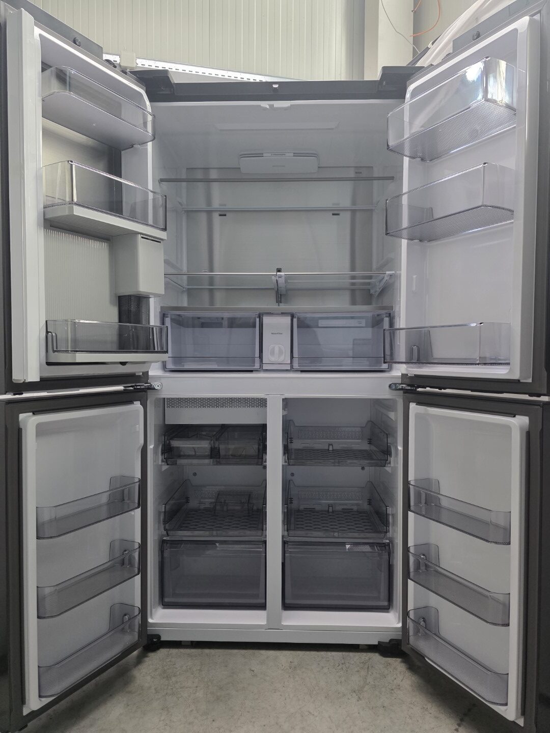 * Lumina roșie se va aprinde când camera video funcționează. Aspectul pentru utilizator poate fi prezentat, dar împrejurimile, altele decât alimentele, vor fi încețoșate automat.** Din martie 2024, AI Vision Inside poate recunoaște 33 de alimente, cum ar fi fructele și legumele proaspete. Dacă mâncarea nu este recunoscută, este posibil să fie listată ca element necunoscut. AI Vision Inside nu poate identifica sau enumera niciun produs alimentar în coșurile din ușa frigiderului sau din congelator. Recunoaște alimentele conform modelelor de memorare profundă, care pot fi actualizate periodic, pentru a îmbunătăți acuratețea.*** Este posibil ca utilizatorul să fie nevoit să opereze manual lista pentru acuratețe.**** Aplicația SmartThings este disponibilă pe dispozitivele Android și iOS. Sunt necesare o conexiune Wi-Fi și un cont Samsung. Trebuie să utilizezi același cont de conectare între dispozitive.