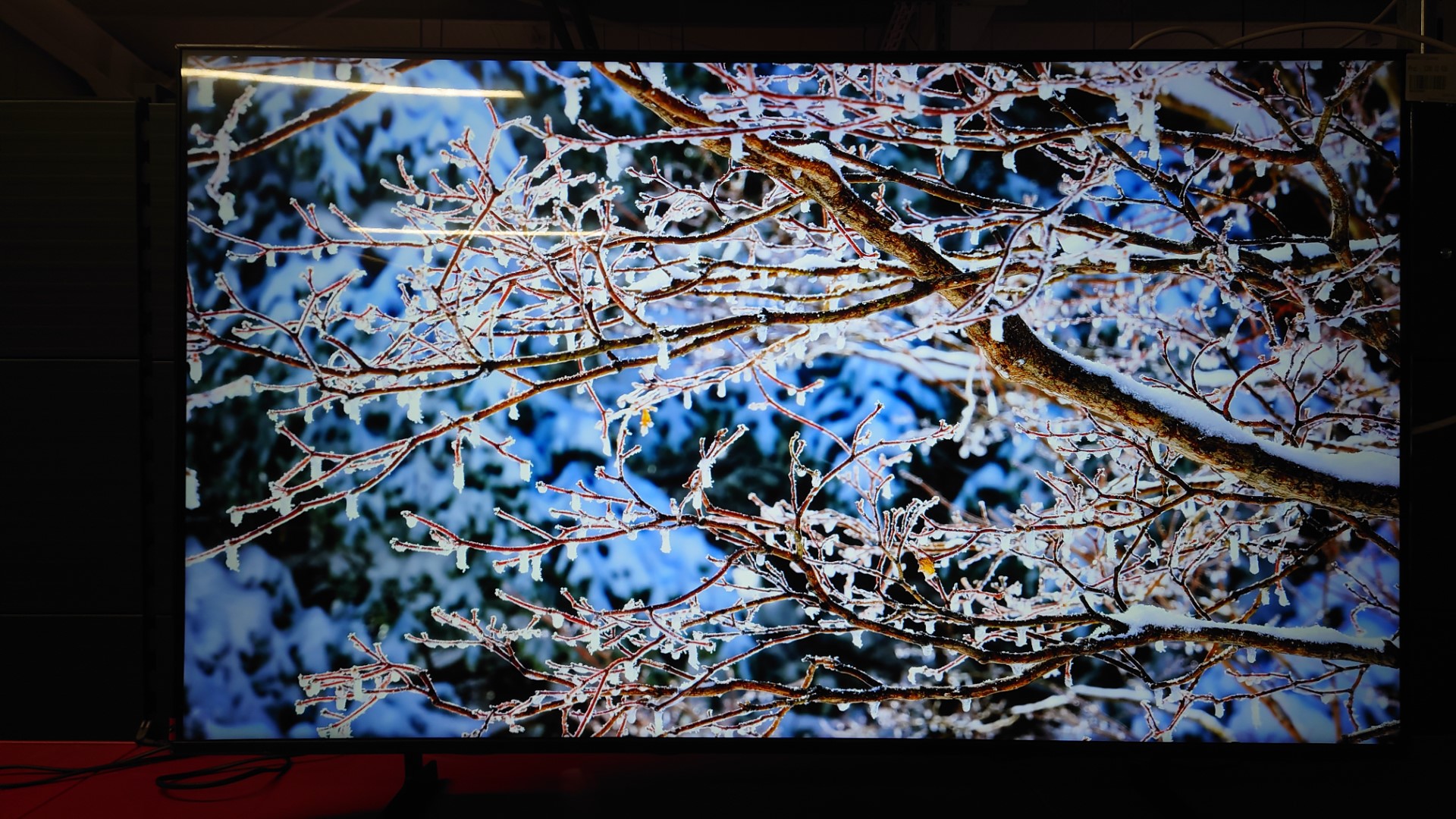 A wall-mounted TV shows popular apps and curated content on the home menu.