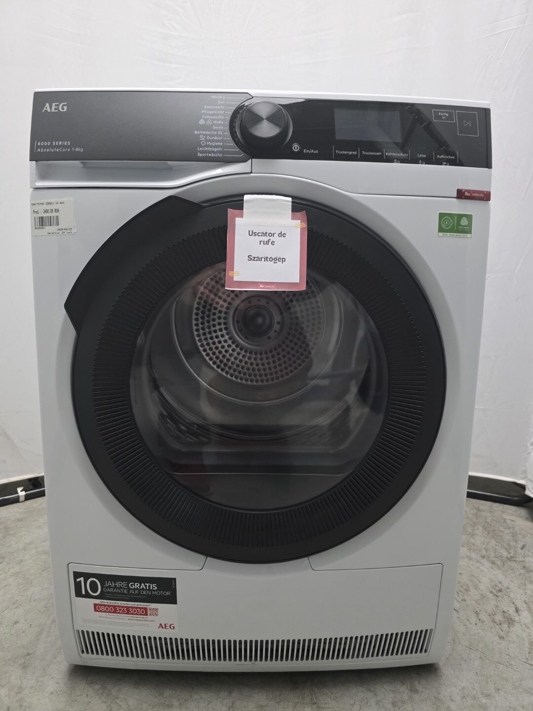 Uscator de rufe AEG, 8 KG, Clasa B, Heat Pump Dryer, Series 8000 cu AbsoluteCare, Child-Lock, MixDry, Gentle Drum, Alb, TR8T75780